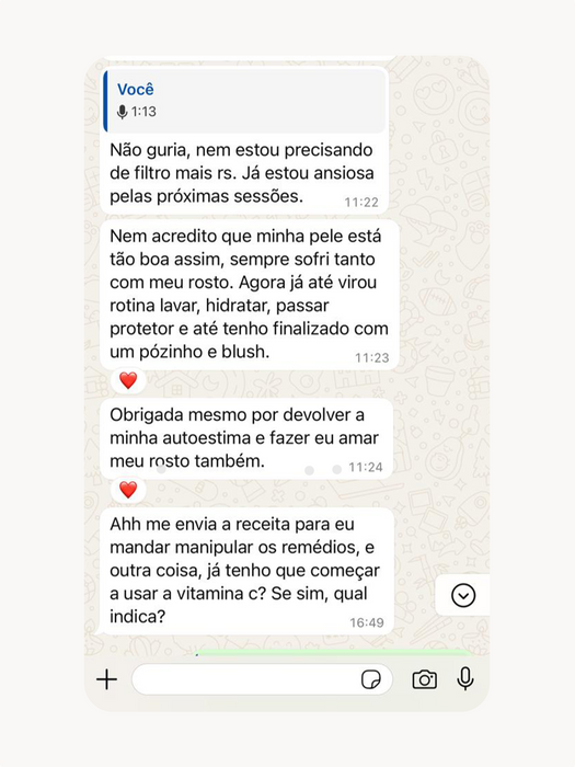 Com olhar atento aos detalhes, une técnica e sensibilidade artística para promover autoestima e bem-estar. Para ela, cada procedimento vai além da estética: é sobre resgatar a essência e revelar a melhor versão de cada pessoa.